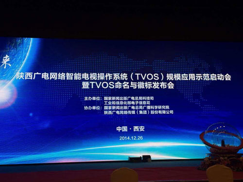 12月26日,陕西广电网络智能电视操作系统(TVOS)规模应用示范启动会暨TVOS命名与徽标发布会在西安曲江惠宾苑宾馆举办。国家新闻出版广电总局科技司王效杰司长在会上介绍了TVOS规模应用示范的规划,并发布了TVOS中文品牌名称及Logo。同时,王效杰介绍说,计划在2015年12月,发布TVOS2.0。
