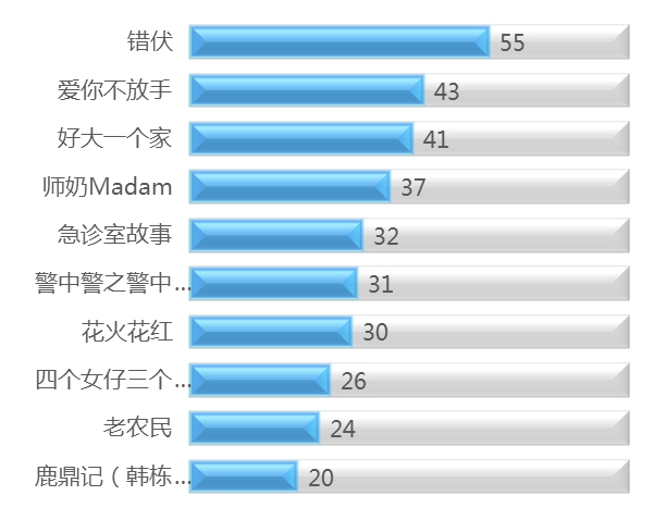 抗战电视剧《错伏》仍居本周电视剧榜单第一位,并已三周连续蝉联榜首。《爱你不放手》又名《真爱谎言2》以韩振宇与徐盈“夺子”为主线,讲述一段虐心而又感人的励志故事,由上周排榜第四为上升至本周第二位。阔别荧屏十几年后的陈佩斯自导自演,讲述一群在各方矛盾冲突裹挟下一度错乱又各归其位,从小家变成了大家故事的电视剧《好大一个家》1月27日上映,本周首登电视剧周榜并排名第三位。