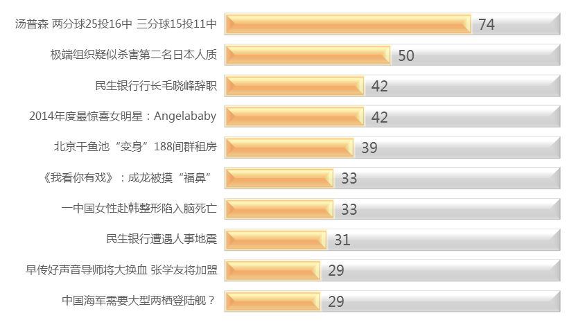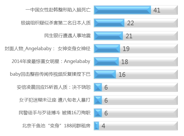 近几年“医疗旅游”的流行,人们觉得花几天时间去趟韩国,回来就能变美,十分方便。但近日,一位中国女性在韩国接受整形手术后陷入脑死亡,此条新闻引发社会的关注。《一中国女性赴韩整形陷入脑死亡》本周视频新闻热力度排名第一。北京时间2月1日凌晨,极端组织发布视频声称他们已将日本人质自由记者后藤健二斩首,日本人质事件被再次推向舆论高潮,《极端组织疑似杀害第二名日本人质》、《安倍凌晨回应IS斩首人质:决不饶恕》本周视频新闻周榜分别排名第二、第七位。