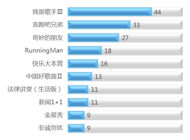 《我是歌手Ⅲ》本周继续蝉联视频栏目周榜榜首。《奔跑吧兄弟》上周跌榜第七位,本周重上第二位。首档人与动物亲密接触的真人秀节目《奇妙的朋友》本周被挤落第三位。