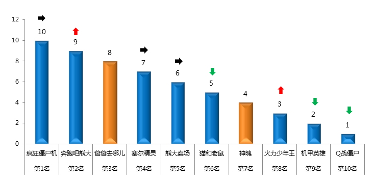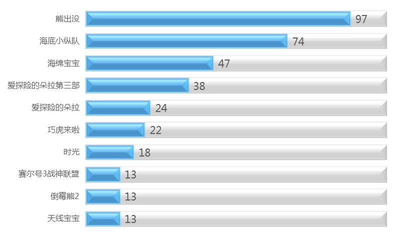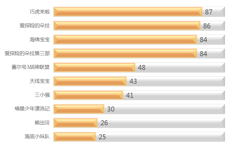 从少儿节目周榜排名变化上看,小朋友们的忠诚度相对较高,基本上由《熊出没》、《海底小纵队》、《海绵宝宝》、《爱探险的朵拉》、《巧虎来啦》五档节目轮动争榜,目前其他少儿节目很难挤入少儿节目周榜前6名。