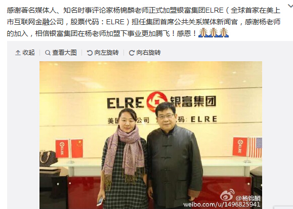 前凤凰卫视知名主持人杨锦麟日前确认加盟深圳一家P2P公司银富集团,担任集团“首席公共关系媒体新闻官”。