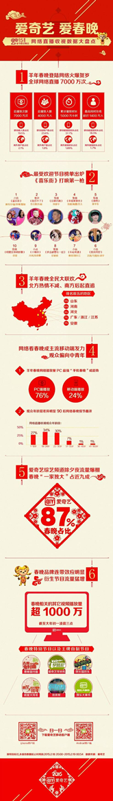 在刚刚过去的2015羊年央视春晚中,爱奇艺作为全球独家直播视频平台创下以同时最高在线人数超过1400万人的惊人成绩,以近10倍的优势远超过此前世界杯期间创下的全球网络在线直播单平台146万人次的纪录,创造了新的全球在线直播纪录。同时在4个多小时的春晚直播中,爱奇艺总播放人数超4000万人、总播放次数超过7000万、累计播放时长超1.04亿小时,各项数据领跑行业树立在线直播新标杆。