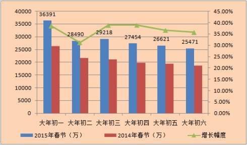 据统计:2015年春节档(2月19日—2月24日)全国电影市场票房17.36亿元,羊年春晚不负众望再创新的辉煌,相比去年同期增长36.69%;随着影院银幕数扩容,春节档共放映88.76万场,观影人次达4416万,相比去年分别增长24.43%,26.35%。