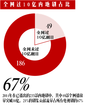 2014年共有49部国产电视剧表现突出,全网播放量达到10亿及以上的好成绩,并且这不到25%的剧目贡献流量占所有(235部)电视剧的67%。