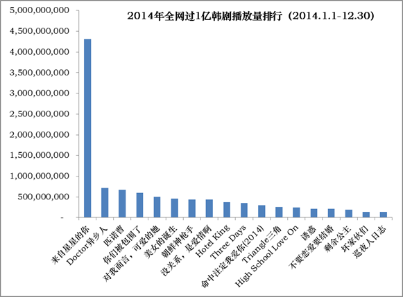 在全网57部过1亿的海外剧中,韩剧为18部,贡献整体(57部)流量的44%。各家视频网站最爱引进的剧集是韩国三大电视台中SBS家的剧,2014韩剧播放量TOP10中SBS也不负众望占位8个,在赚的盆满钵满的同时也打响了其在中国的品牌知名度。