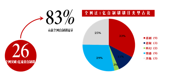 2014年收录于剧星传播PV-TOOL数据库全网自制节目共123档, 其中自制剧高达90部,占据全网自制资源(123档)流量的76%。自制剧看似体量巨大,但实则尚处于野蛮生长阶段,超过50%的自制剧几乎毫无存在感,2014年仅26部自制剧全网播放量过1亿,而全网自制剧83%的流量就依靠这26部剧的贡献。在题材方面,播放量较好的仍属喜剧题材,诸如搜狐视频的《屌丝男士》、《极品女士》系列,优酷土豆的《万万没想到》系列等,对视频网站而言,喜剧类自制剧风险低回报高,是快速拉拢观众的捷径。