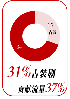 按照数据表现来看,古装剧仍然是最受观众欢迎的剧目类型,49部中有15部均为古装剧,31%的古装剧贡献了整体(49部)流量的37%。其中最瞩目的数据表现无疑是年度播放量话题双料王的《古剑奇谭》,其仅用半年时间全网播放量就已经达到132亿。