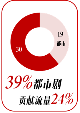 相对于古装剧而言,都市剧明显体量大的多。在全网49部过10亿的剧集中有19部均为都市剧,贡献流量24%。与剧目数量相比,都市剧的流量表现实属一般,可提升空间巨大。