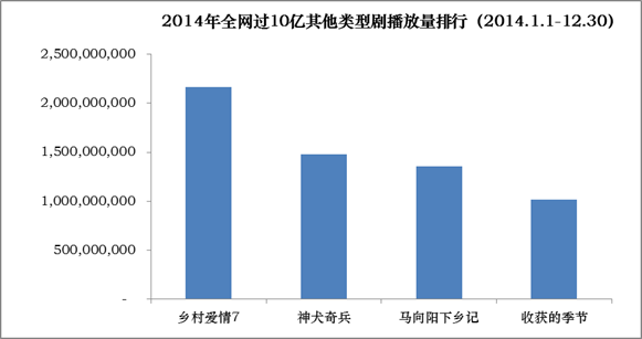 除了古装、都市、年代之外,诸如农村、现代军旅等题材亦有表现亮眼的剧目。2014年农村题材终于在《乡爱》系列之外挖掘出新生力量,由萌叔吴秀波主演的央视大戏《马向阳下乡记》以全网13.58亿的播放量证明了网络受众不只局限于情情爱爱,朴实农村生活也有春天。