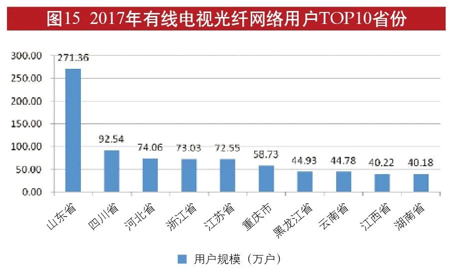 从各省情况来看,截至2017年年末,光纤网络用户规模排名前十的省(市)分别是:山东(271.36万户)、四川(92.54万户)、河北(74.06万户)、浙江(73.03万户)、江苏(72.55万户)、重庆(58.73万户)、黑龙江(44.93万户)、云南(44.78万户)、江西(40.22万户)、湖南(40.18万户)。(见图15)