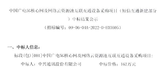 3月底,《中国广电5G核心网及网络云资源池互联互通设备采购项目(短信互通新建部分)中标候选人公示》发布。中兴通讯股份有限公司以162万元的投标报价成为中标候选人第1名,新华三技术有限公司以463.4876万元的投标报价成为中标候选人第2名,工期/交货期/服务期为14天。