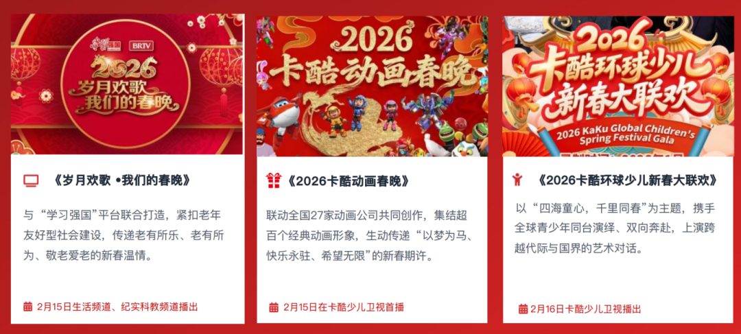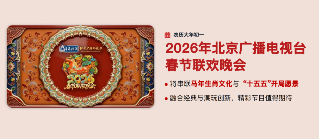 此外,北京广播电视台春节期间还将播出《百花迎春——中国文学艺术界2026春节大联欢》等精品文艺演出,彰显文化底蕴与时代气象。