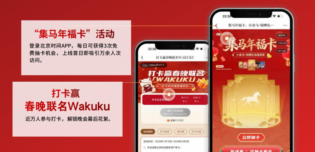北京时间于2月6日上线《北京大视听·春天马上来》特别专题,生动展播新春故事。2月4日至3月3日,推出“集马年福卡”活动,登录北京时间APP,每日可获得3次免费抽卡机会。开设北京台春晚抽奖专区,开启“宠粉大转盘”“打卡赢春晚联名Wakuku”等互动活动,解锁晚会幕后花絮。