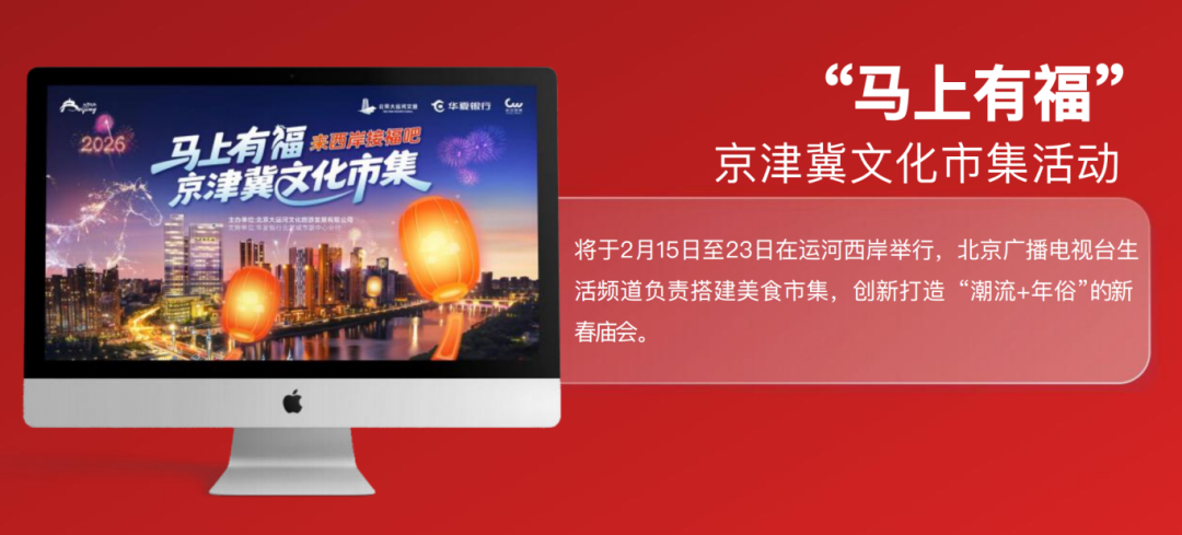 “马上有福”京津冀文化市集活动将于2月15日至23日在运河西岸举行,北京广播电视台生活频道搭建美食市集,创新打造“潮流+年俗”的新春庙会。