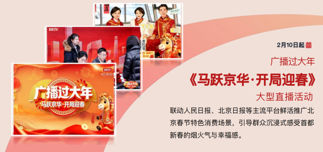 全台7套广播频率将于2月10日起同步推出广播过大年《马跃京华·开局迎春》大型直播活动,联动人民日报、北京日报等主流平台鲜活推广北京春节特色消费场景,引导群众沉浸式感受首都新春的烟火气与幸福感。