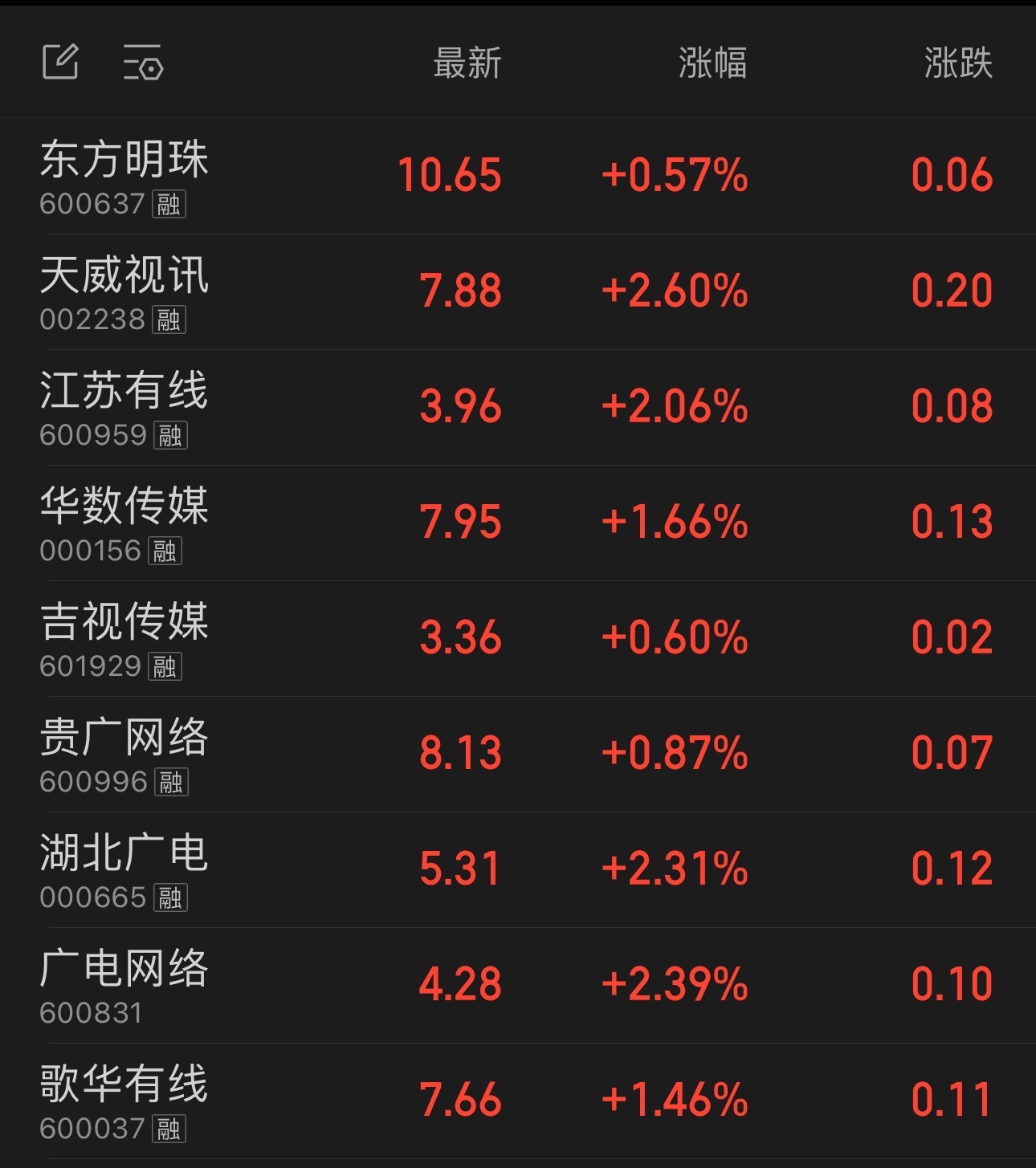 广电网络板块涨跌幅情况:
