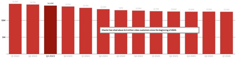 特许通讯(Charter Communications)近日公布的2026年一季度财报显示,公司正处于转型的阵痛期。尽管付费电视用户流失量收窄至5.1万,远优于去年同期的16.7万,但互联网业务却遭遇挑战,单季流失12万用户,较去年同期翻倍。受宽带与电视业务双重承压影响,公司季度营收降至136亿美元,股价应声重挫约24%。